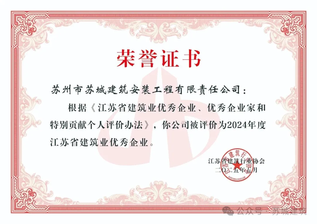 在近日公布的江蘇省建筑業(yè)年度評(píng)優(yōu)中,蘇州市蘇城建筑安裝工程有限公司榮獲“江蘇省建筑業(yè)優(yōu)秀企業(yè)”稱號(hào),董事長(zhǎng)陸小弟先生獲評(píng)“江蘇省優(yōu)秀企業(yè)家”!雙項(xiàng)榮譽(yù),彰顯卓越!同時(shí)我們衷心感謝各級(jí)領(lǐng)導(dǎo)的關(guān)懷指導(dǎo)與社會(huì)各界朋友們的鼎力支持。這一"雙優(yōu)"榮譽(yù)的獲得,不僅是對(duì)蘇城建筑在行業(yè)深度調(diào)整中保持穩(wěn)健發(fā)展的充分肯定,更是對(duì)我們四十多年來(lái)深耕建筑領(lǐng)域、堅(jiān)持創(chuàng)新發(fā)展的最佳褒獎(jiǎng)!